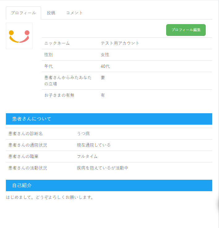 似た立場の人同士でつながりやすいようにしました。プロフィールに「夫」「母」といった患者さんとの続柄や、年代を登録できるようになっていて、プロフィールを見ながら属性が近い人とつながれる設計にしています。属性の近いご家族同士で話すことで孤独を解消できますし、経験的な情報から自分に役立つアドバイスが得られるのも良いところです。ずっと1人で悩みを抱えてしまうと考えが凝り固まって、苦しくなってしまいますよね。「同じ立場でも、こういう考え方もあるんだ」と気づくことで新しい視点が見えるようになりますし、今後の患者さんへの接し方の参考にもなると思います。例えば「自分を犠牲にしても患者さんをサポートしなきゃ」と考えていた人が、「自分自身のこともケアしないといけないよね」という考え方を得られるだけでも、大きな変化だと思います。